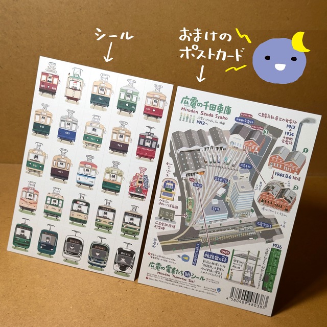 ■ひろでん(広島電鉄)の電車のシール。 ■サイズはポストカードサイズ SDGsを考えて材質は紙にしました ■広島電鉄千田町車庫の鳥かん図 ポストカード付きです。 ●シール 印刷○オフセット印刷 用紙○上質紙 ●ポストカード イラスト面○ 「広島電鉄千田町車庫の鳥かん図」 あてな面○ 「車両のキャラクターイラストと 方言などでひと言」 印刷○オフセット印刷 用紙○上質紙 ※広島電鉄商品化許諾済 ●増刷のときに デザイン・体裁等 変更しているときがあります。 ご容赦ください。 ■「BASE」以外での販売店 ●広島駅「アントレマルシェ広島」 ↑在来改札内改札隣り ●平和公園・レストハウス ●広島市こども文化科学館 ●広島市郷土資料館 など (2026年3月17日 現在) (売り切れのときは、申し訳ありません) ■おまけのポストカード 「広島電鉄千田町車庫の鳥かん図」 あてな面の解説です。 □千田車庫は きょーもにぎやか(広島弁) 「千田車庫は 今日もにぎやか」 ▶広電100形 がんす(古い広島弁) →「~です」の意味といわれますが 「だけど」の意味もあるらしいです (「がんす横丁」薄田純一郎 編 たくみ出版より) ▶広電150形 よーきんさった(古い広島弁) →「よく来られました」 ▶広電200形 グーテンモルゲン(ドイツ語) →「おはようございます」 (元ドイツ・ハノーバー市電) ▶広電350形 ほいじゃーね(広島弁) →「それではまたね」 ▶広電570形 ほなね(神戸弁) →「それではまたね」 (元神戸市電) (参考サイト https://shiori-tabi.jp/posts/808) ▶広電600形 ばってんがくさ(博多弁) →「だけどさ」 (元西鉄・北九州線) ▶広電650形 ほいじゃがの~(広島弁) →「だけどさ」 ▶広電700形 のりんちゃいや(主に女性の広島弁) →「乗りなさいよ」 男性だと「のりんさい」 ▶広電750形 もーかりまっか?(大阪弁) →「もうかりますか?」 (元大阪市電) ▶トランルージュ のまへん?(大阪弁) →「飲みに行きませんか?」 (元大阪市電) ▶広電800形 のみいかん?(広島弁) →「飲みに行きませんか?」 ▶広電900形 なんでやねん(大阪弁) →「どうしてそうなるの」 (元大阪市電) ▶広電1150形 なにしとぉ?(神戸弁) →「なにしてるの?」 (元神戸市電) (参考サイト https://shiori-tabi.jp/posts/808) ▶広電1900形 おこしやす(京都弁) →「いらっしゃいませ」 (元神戸市電) ▶広電3000形 なんばしょっと?(博多弁) →「なにしてるの?」 (元西鉄・福岡市内線) ▶広電3100形 なんしょーるん?(広島弁) →「なにしてるの?」 ▶広電3700形 きょーいく?(広島弁) →「今日行く?」 ▶広電3800形 きょーいかん(広島弁) →「今日行かない」 ▶広電3900形 はよしんさい(主に女性の広島弁) 男性だと「はよせーや」 →「早くしなさい」 ▶広電3950形 ぶちこんどる(広島弁) →「とても混んでいる」 ▶広電5000形 ダンケシェーン(ドイツ語) →「ありがとう」 (ドイツ・シーメンス社製) ▶広電5100形 へいわじゃね~(広島弁) →「平和ですね」 ▶広電1000形 ちーとたいぎ~(広島弁) →「少しだるい」 ▶広電5200形 にぎやかじゃね~(広島弁) →「にぎやかですね」